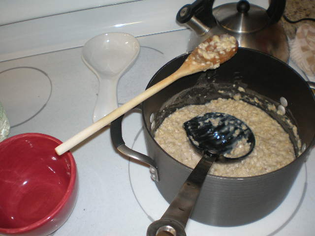 Once the oatmeal is done, keep the pot on low heat and dunk in a soup ladle for serving.  Set out all the add-in options along the counter, along with a stack of bowls and spoons.  People can serve themselves at their leisure.  Makes for a fantastic lazy weekend morning.  I’ve read that you can also cook oatmeal in a crockpot overnight, so that is an option if you don’t want to cook it in the morning.