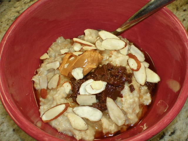 Everyone can personalize their oatmeal however they wish.  I enjoyed a scoop of peanut butter, a scoop of Cacao Bliss, a drizzle of maple syrup and a sprinkle of sliced almonds in my bowl.