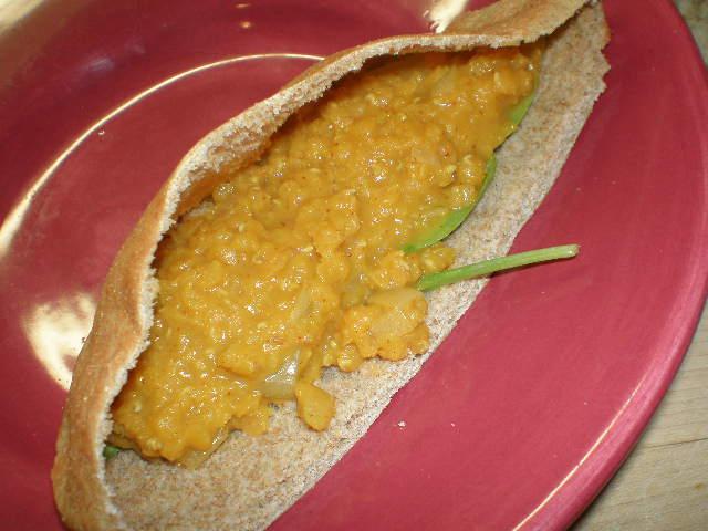 The recipe said to serve the curry with rice, but I didn’t feel like cooking rice so I had mine in a pita with a bit of spinach.  It was delicious!  I had two of these by the way.  Plus some leftover stir-fry vegetables.  Apparently I worked up an appetite weeding the flower bed.