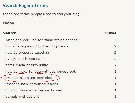 So one of the things I love about having my blog on WordPress is that I get to see the search terms that lead people to my blog. As I mentioned the other day, I’ve been getting a lot of hits on zucchini, likely because people are harvesting truckloads of zucchini from their gardens and wondering what to do with it all. Someone did have an interesting problem with zucchini the other day: