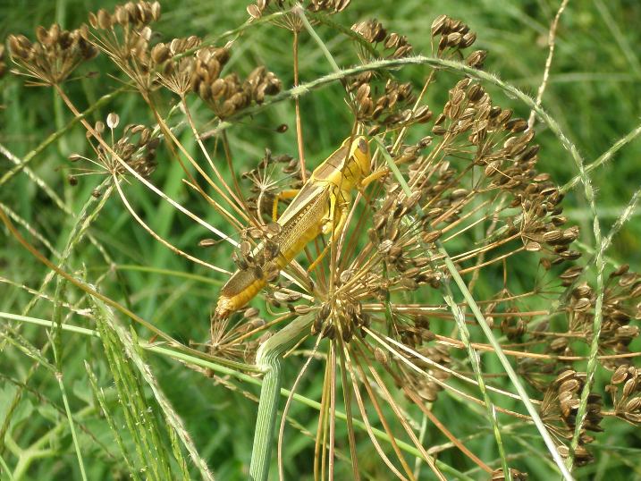 And then I saw this pretty yellow grasshopper sitting on the dried dill plants: