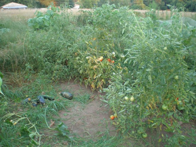 Here is a shot of the tomatoes on the north end of the garden. Where the zucchinis are lying on the ground is where the plants used to be. This is a big improvement from before because you can actually see the ground instead of weeds!