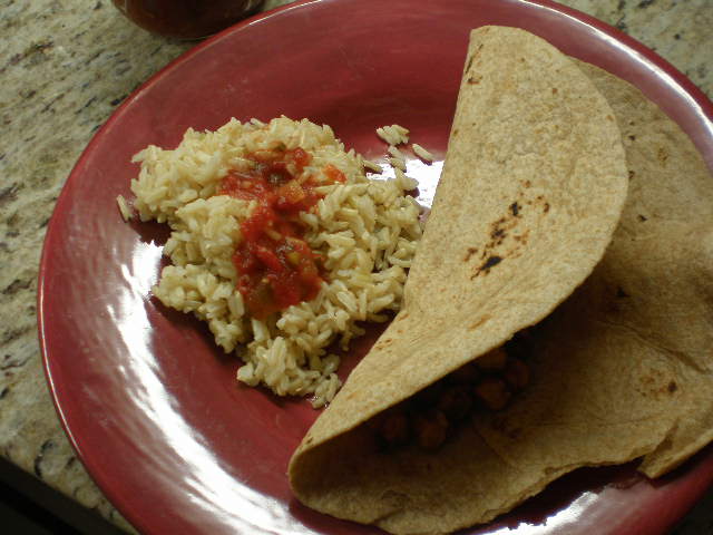 This recipe came together very easily and very quickly. I used a jar of chickpeas I had cooked from dry last weekend using the crockpot method. Benzo mixed up some spices to make homemade taco seasoning. I also cooked up a batch of brown rice using this method, which is the easiest way to cook brown rice. Here is my finished plate: