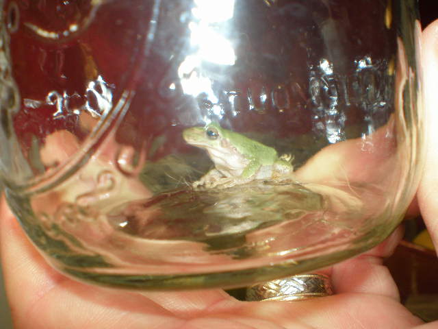 After dinner when Benzo let the dogs back outside a little green FROG jumped through the back door and into the kitchen! Luckily we saw him and acted fast to capture him in a jar. I shudder at the thought of what the cats would’ve done to him if we hadn’t gotten to him first. Ultimate cat toy for sure.