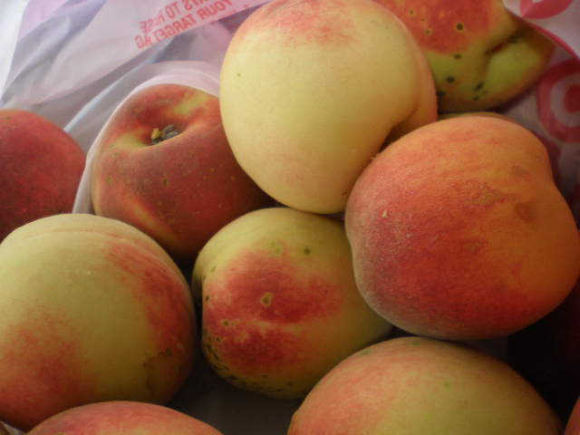 On Saturday morning one of my neighbors came by to tell us that his peach trees were producing and to let him know if we wanted any peaches. I didn’t have to think very long before I said “YES”. I went by on Sunday to get some but he was already out for the day. Luckily his wife stopped by last night with 10 pounds of peaches for us. I offered to pay of course and she would only take $7! Seven bucks for 10 pounds of local peaches!