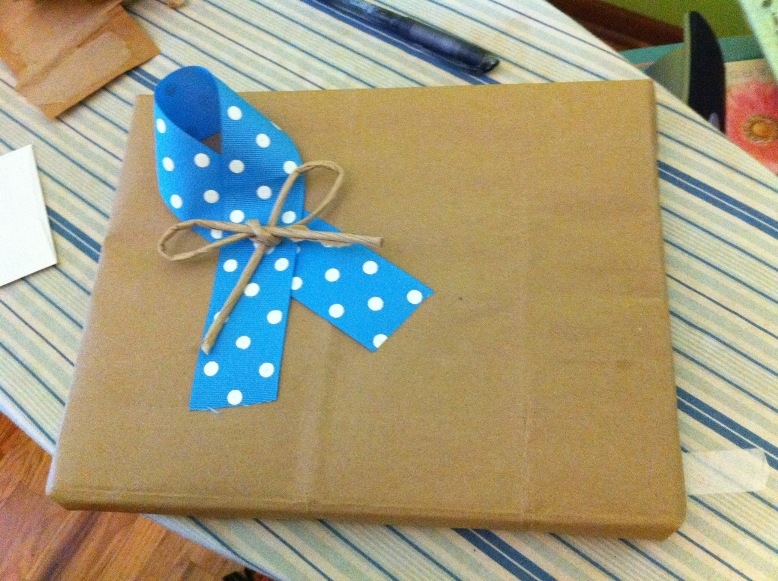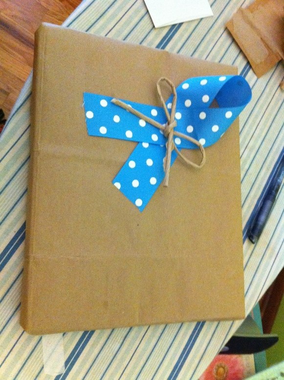 I actually wrapped the book with a cut up brown grocery sack.  Then I used that bit of blue polka dot ribbon to make the loop.  Then I took the handle from the sack I cut up and tied it into a bow and glued it on top of the ribbon with craft glue.