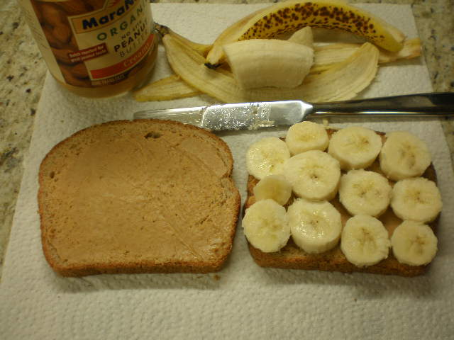 I came home from work last night and could not decide on dinner.  Benzo was gone so I was on my own.  While I was thinking I ate a whole bunch of chips and salsa.  Well after that I wasn’t that hungry.  So I did a few things around the house and then came back to the kitchen a little bit later to figure out the rest of my dinner.  I had two bananas that were on their last legs so I decided on this PB&B sandwich.