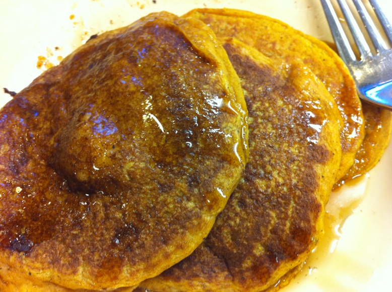 Not too long ago it was Benzo’s birthday.  Being the awesome wife that I am, I decided to get up early and make him breakfast in bed.  It is finally feeling like fall around here and to me fall = pumpkin.  I absolutely love pumpkin and had cracked a can open the day before to make pumpkin oatmeal.  I had about a cup of pumpkin leftover, which was the perfect amount to make pumpkin pancakes.