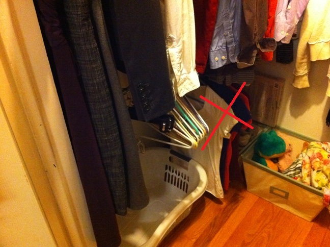 Remember my low closet pole? The one I had to add because I had too many clothes? It’s empty now except for a few t-shirts not on the list that I still need to take out. And now I have a space for my laundry basket!