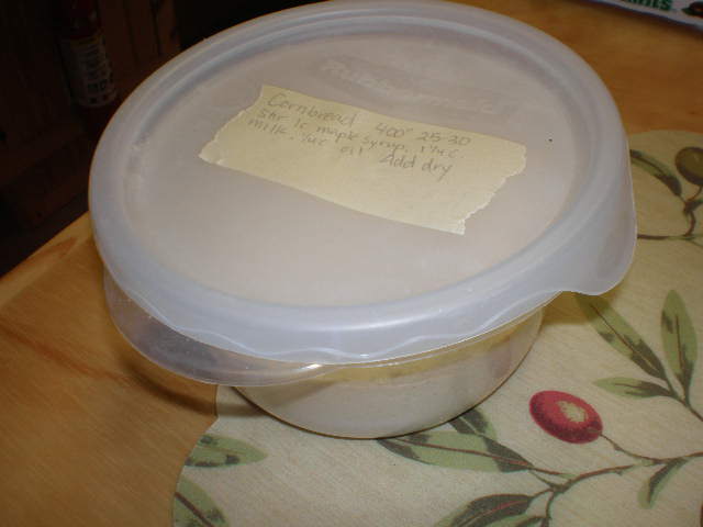 For example, I planned to make cornbread on Friday night. Instead of buying a cornbread mix to take to the cabin, I simply mixed the dry ingredients in a container on Friday morning. Then I labeled it with the rest of the directions and voila! My own cornbread mix.