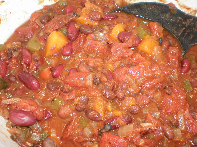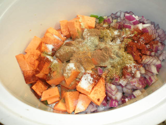 I found what appeared to be a great recipe in the January 2011 issue of Real Simple (I’m a subscriber). It is for Slow Cooker Vegetarian Chili with Sweet Potatoes. Real Simple is great about including at least one vegetarian recipe in their issue every month. Usually more than that. When I saw this one I thought “I love chili and black beans and sweet potatoes so this will be great!” I decided to try it out a couple of weeks ago.