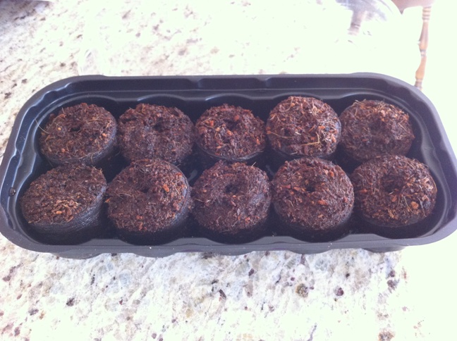 The greenhouse kits come with instructions so I don’t really need to give a blow by blow of what we did.  Basically you pour water over the entire thing so the pellets expand and then drop 1-2 seeds in each one and cover them up.  Then you keep the lids on the trays until the seeds germinate.  Then take the lids off and place them in a sunny spot or under a light.  Here’s what the pellets look like after a good soaking: