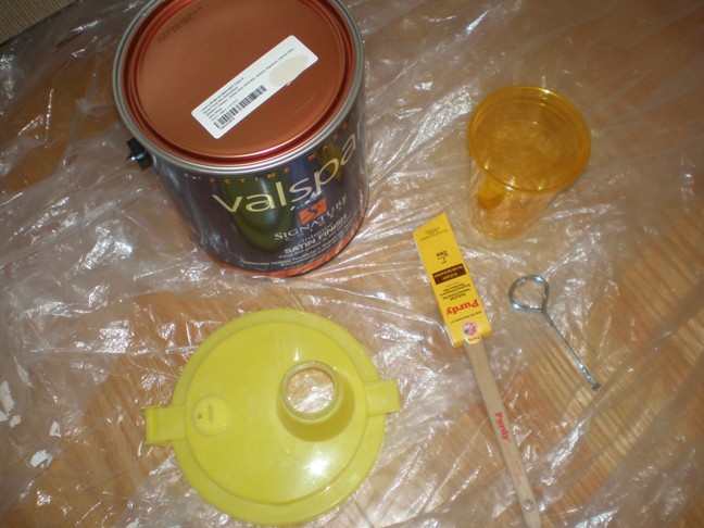 - A plastic cup. When I’m cutting in a room (painting around the edges) I pour paint into a plastic cup and then carry that around with me to paint. It is much easier than lugging the can around, especially when cutting in up high near the ceiling. And I don’t like to wipe my paint brush on the edge of the paint can because it gets the edge all gunky.