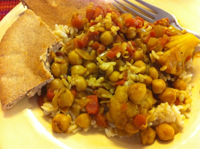 This curry is very similar to another chickpea curry I made, but I swapped cauliflower for potatoes and used diced tomatoes instead of tomato soup. The other recipe called for condensed tomato soup and I’m not too hip on using condensed soup as it has a lot of crap in the ingredients. So I decided to used plain diced tomatoes instead. I also used cauliflower instead of potatoes because I didn’t have any potatoes on hand.