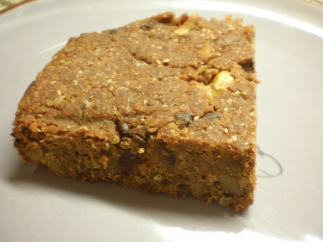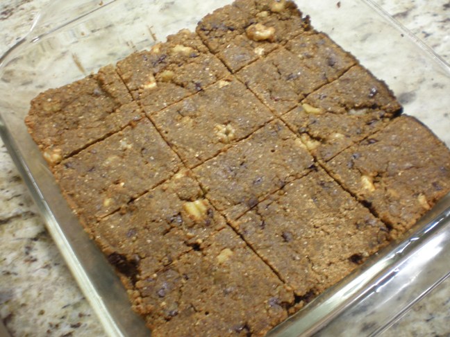 I found this recipe weeks ago and finally got around to making it last night. I made it exactly as written, using my chocolate brown rice protein powder and chopped walnuts and mini-chocolate chips as the add-ins. It was pretty easy though I had to use the dreaded food processor. The only issue I had was at the end when stirring the dough together. It was so thick that I couldn’t get the wet and the dry ingredients to mesh. I added a splash of milk and that helped. Then I mashed it down into the pan and baked as directed.