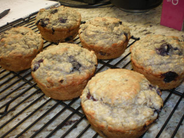 I thought these muffins were very tasty. Benzo agreed. The oats, wheat flour, flax and walnuts make them a little bit more substantial than just a white flour and white sugar blueberry muffin. They were perfectly moist and did not crumble apart at all, even while warm. I slathered them up with Earth Balance and thoroughly enjoyed myself. 🙂