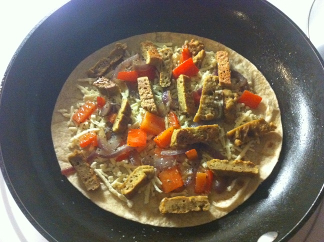 I topped a tortilla buttered with EB with the seitan stripps and added some cooked peppers and onions and daiya cheese. Then topped with another buttered tortilla. Brown on both sides until cheese is melted.