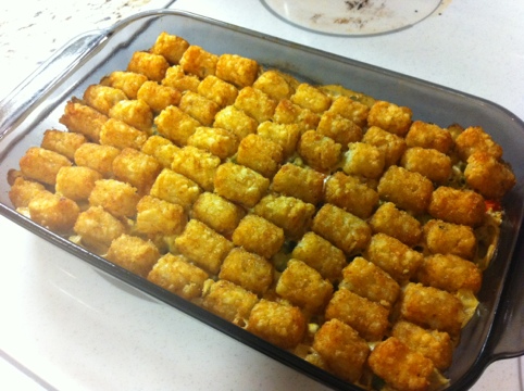 So back to the tater tot casserole.  A long time ago my youngest SIL was talking about tater tot casserole and I’ve wanted to make it ever since.  I think the original version has ground beef and cheese but being mostly vegetarian (fish is my exception) and currently on a dairy-free diet due to breastfeeding that version wouldn’t work for me.