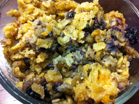 Spread into an 8×8 dish. Bake uncovered at 350 degrees F for 35-40 minutes or until a knife in the center comes out clean.