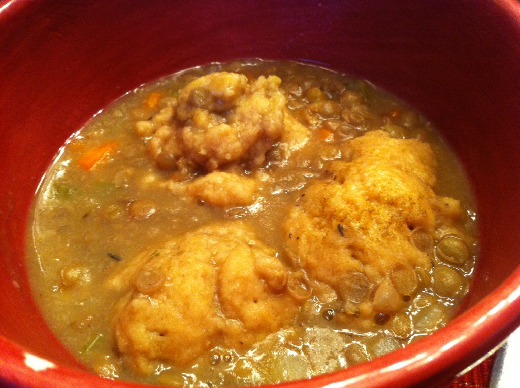 Last night I cooked up a batch of Lentil Dumpling Soup from Hillbilly Housewife. It seems I only make it once every year or so. After last night’s dinner I have no idea why I keep forgetting about it! Last year I made a “no-chop” version with a bag of frozen mixed vegetables.