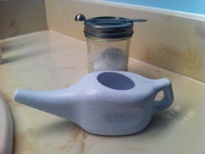 Edited to add: A kind reader let me know that regular tap water might not be the best thing to run through my sinuses. I did some checking for myself and I agree! I now use boiled water with my neti-pot. I boil tap water for 5 minutes in my tea kettle, then let cool and pour into a labeled jar to keep in the bathroom. No big deal and no more impurities to worry about.