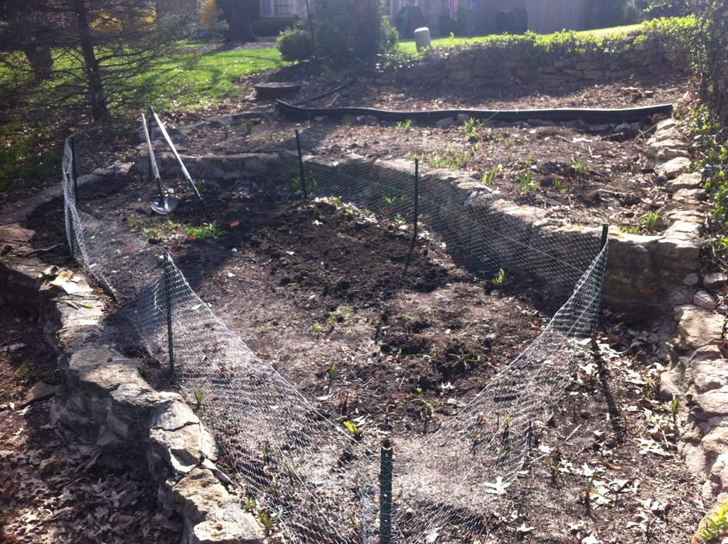 The picture below is a bit closer shot, where hopefully you can see that there are three “tiers”. We set up a fence around the first “tier”. We originally were going to fence the entire thing with one go-round but it didn’t work with the rock border. Separate fences it is!