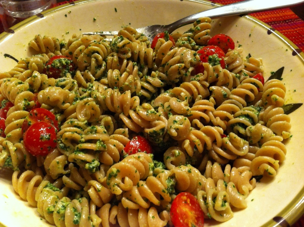 I wasn’t sure of the proportions of ingredients as I was reading through it so I ended up using my old stand-by recipe and subbing kale for the basil. Here is the finished product tossed with pasta and cherry tomatoes from our garden.