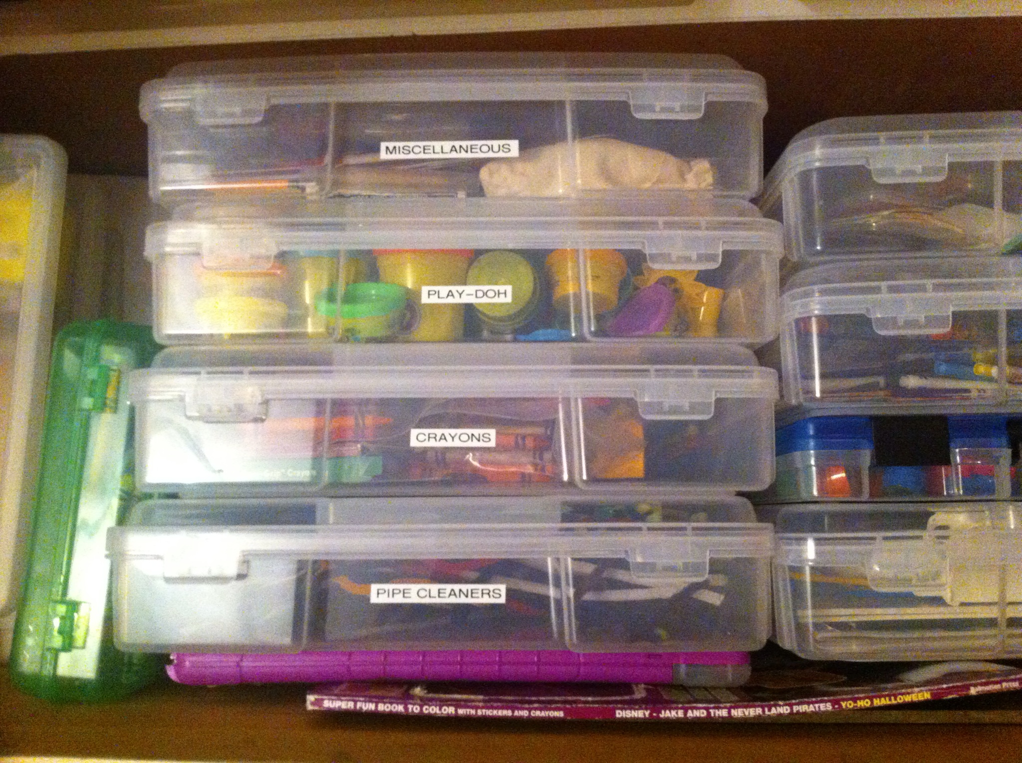 The best part about the whole thing is that it has actually WORKED. Now my 3 year old can get out a box and take it to the table and do a project. Then when he wants to do something else, we can gently encourage him 🙂 to put away the current box before getting out another box. Also when we are trying to clear the table for dinner, it’s much easier to put craft supplies away and slide the cases in the drawer instead of just tossing everything on the counter in a big jumble.