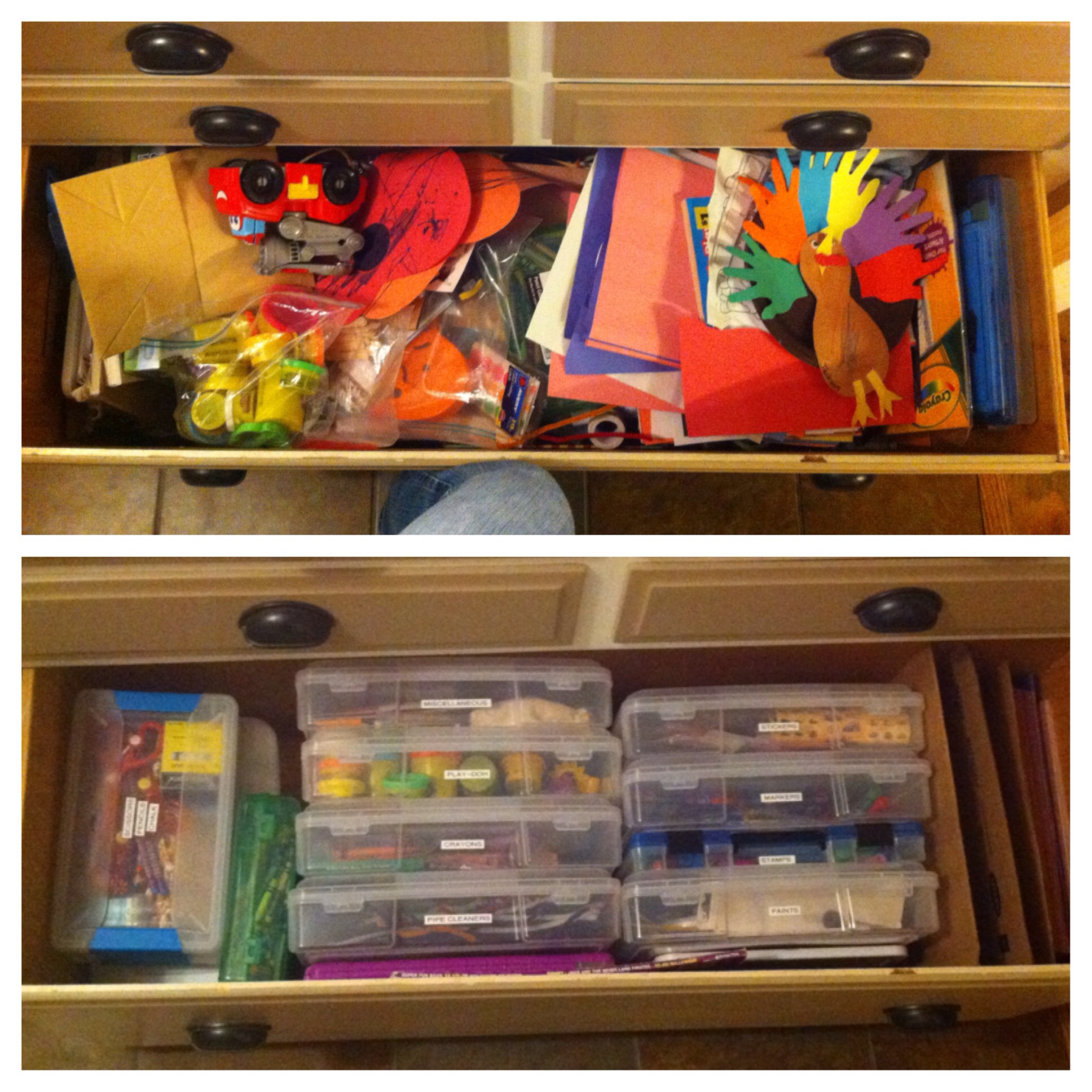 My kids love to do crafts so we have a plethora of craft supplies. The obvious problem with the craft drawer is that we couldn’t find anything in there without a significant effort. The other problem is that the drawer was so disorganized and crammed full that the contents ended up all over the kitchen. We stopped putting them away and ended up piling them on the counters. Then the crafts started getting mixed up with other stuff and it was just a downhill spiral from there.
