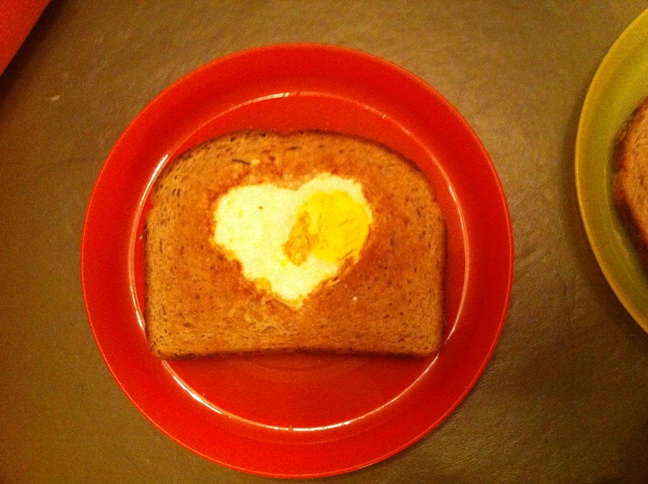 Egg in a nest. I’m definitely not reinventing the wheel here as egg in a nest has been around forever. I remember making it myself as a girl. I had forgotten about it until just the other day my older son and I were up earlier than the other two in our family. Since we had some time to ourselves I thought it would be fun to make egg in a nest for breakfast. And for a special twist we used a heart cookie cutter instead of the standard glass.