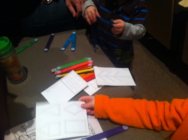 I didn’t originally intend on getting the colored sticks but when I went to the craft store that was all they had. I had my toddler with me and wasn’t about to make a second stop so colored sticks it was. I ended up being really happy I made it with colored sticks because it gives you more opportunities to talk about colors in addition to shapes. The other day while I was making dinner I asked my older son to make a purple house with a yellow roof. The extra element of color captured his interest (instead of just “make a house”). He also gets creative and makes “pizza” or really big, crazy shapes using all the sticks at once. It’s fun to see what he comes up with that’s not on the cards.