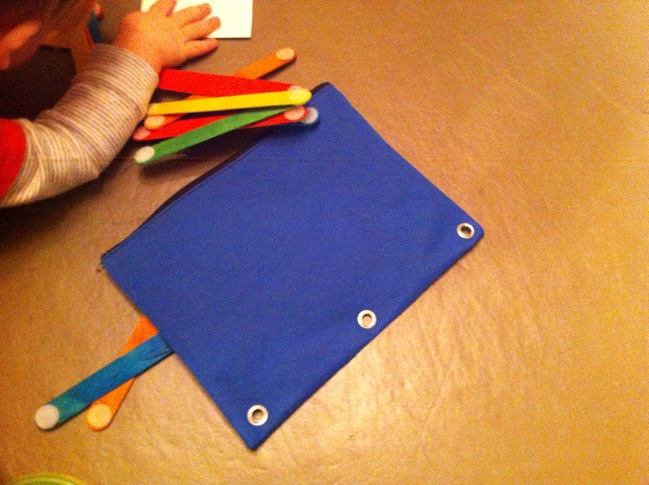 All you need is BIG popsicle sticks, self-adhesive round velcro and something to put it all in. I bought the zippered pouch below at the dollar store. It works perfectly.